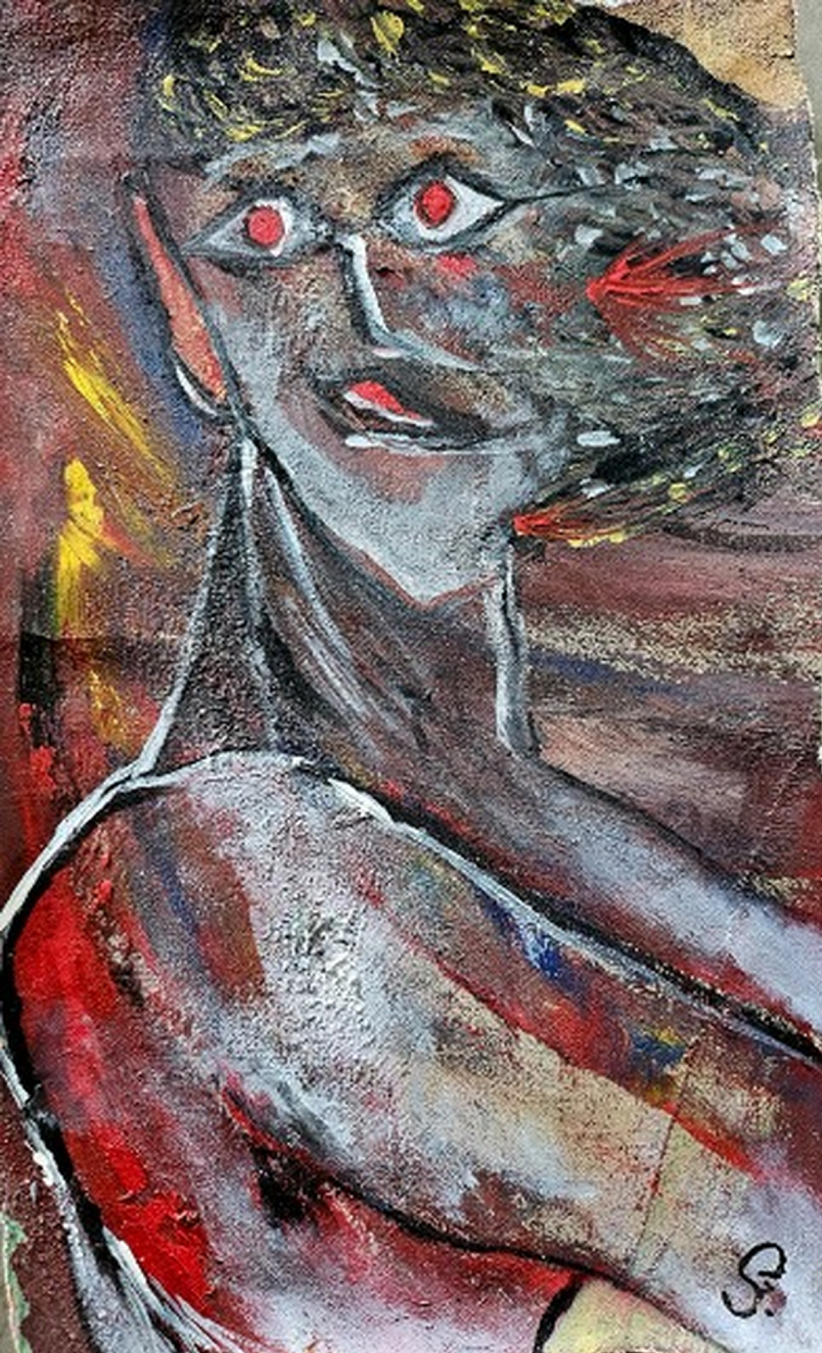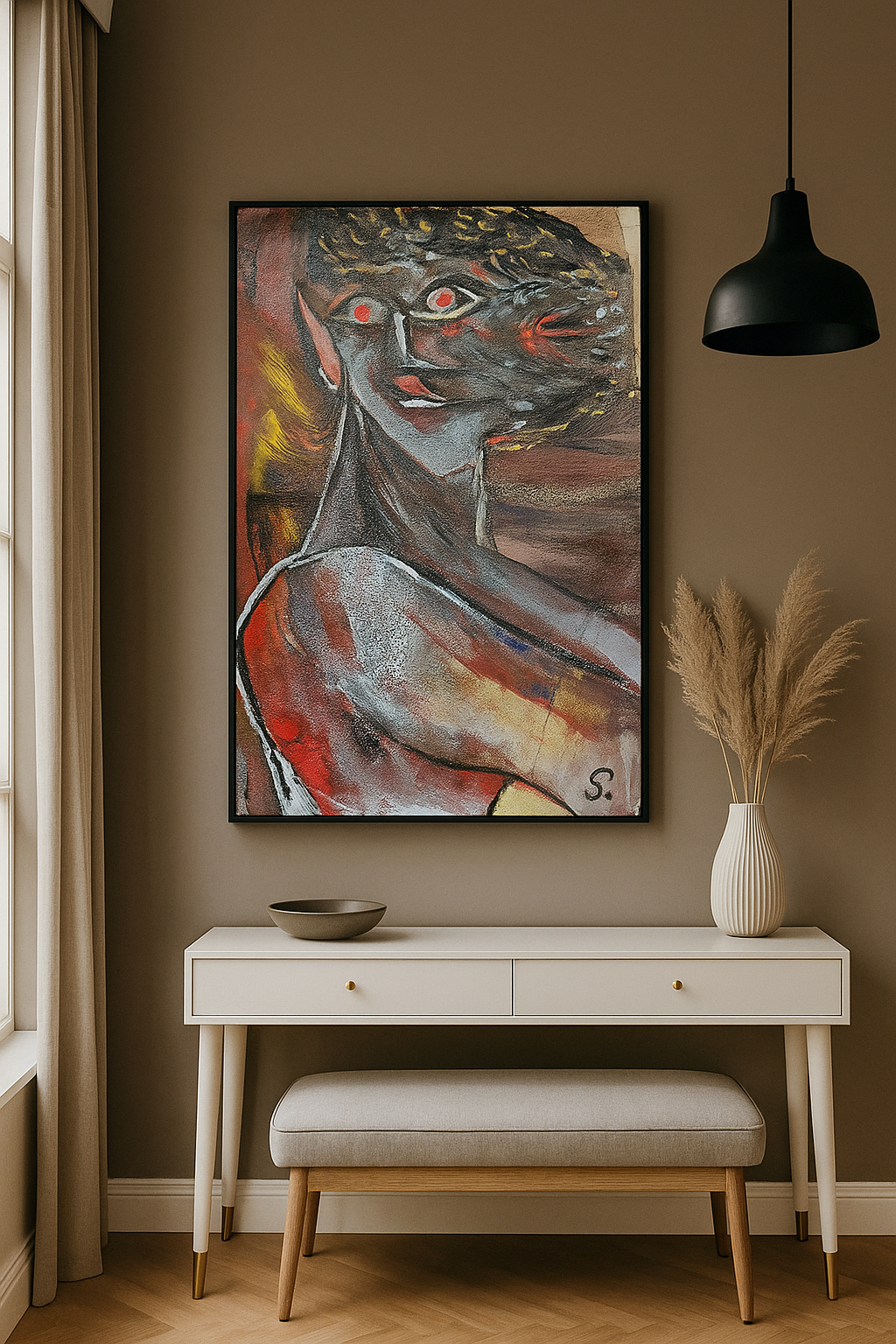 Dans Méduse, je propose une vision intime et poignante de la figure mythologique. Le personnage, au regard rougeoyant, semble surgir d’un univers minéral et texturé, comme pris entre la blessure et la menace. À travers la matière brute et la palette terreuse, je cherche à révéler la part humaine du mythe — celle où la peur, la douleur et la beauté se confondent dans un même souffle tragique.