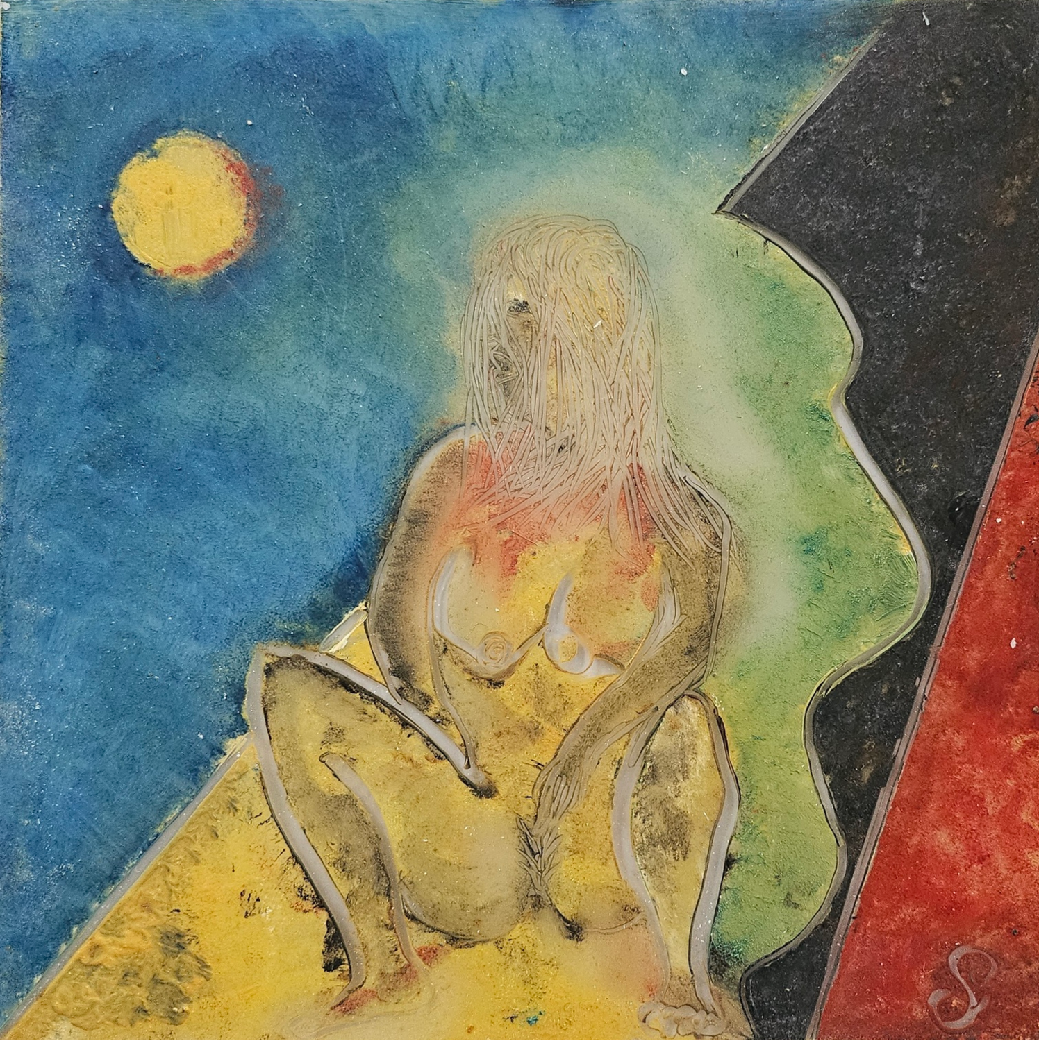 Dans Sous les éléments, je cherche à capturer l’essence d’un être humain confronté à la force brute de la nature. La figure féminine, nue et exposée, s’ancre dans la terre dorée tout en subissant la pression d’une lumière lointaine et d’une ombre menaçante. Par une palette vive et une texture brute, j’explore la vulnérabilité primitive de l’être face à l’univers, ce fragile équilibre entre éblouissement, désir de vie et menace latente