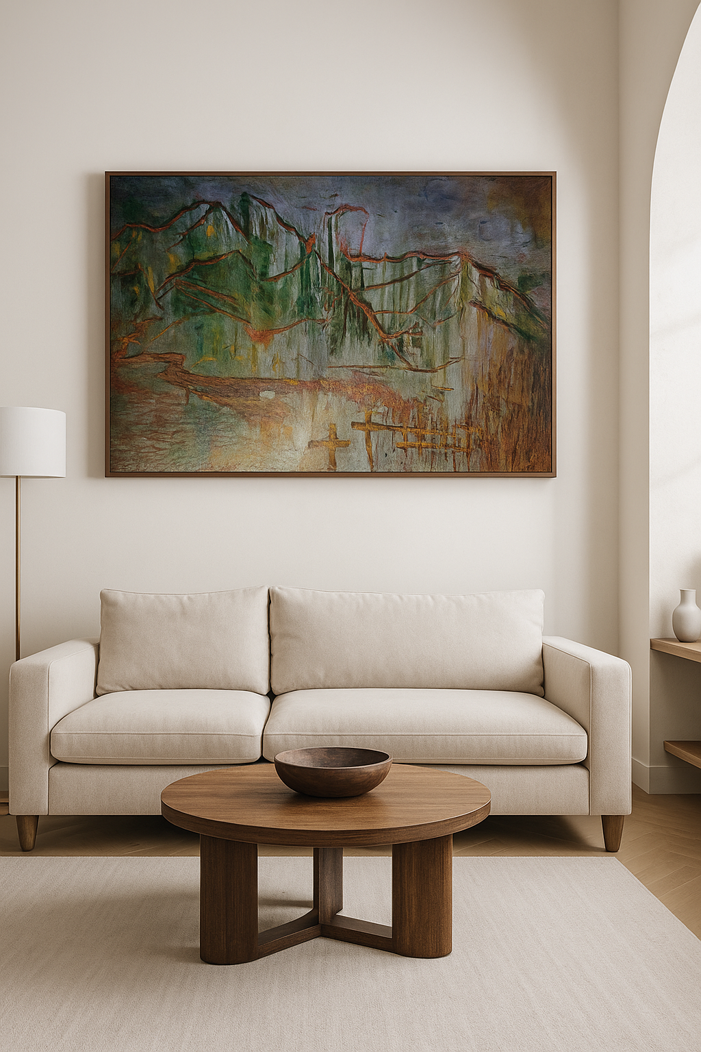 Dans cette toile, j’explore un paysage intérieur autant qu’un territoire imaginaire. J’ai travaillé à l’huile, à la spatule et au pinceau, pour créer des reliefs qui capturent la sensation d’un monde qui se dissout et persiste à la fois. Les retouches numériques sont venues ensuite révéler des lumières enfouies, comme si la mémoire reprenait vie sous la surface. La Vallée de l’Oubli est pour moi un passage — un lieu où les traces du passé se mêlent au vertige du temps, où l’on avance sans savoir ce que l’on cherche, mais en sentant qu’il reste quelque chose à retrouver